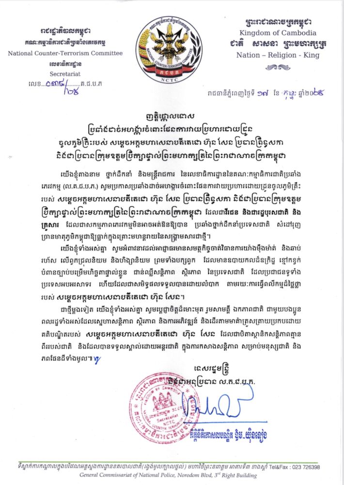 ញត្តិថ្កោលទោស ប្រឆាំងដាច់អហង្ការចំពោះផែនការវាយប្រហារដោយដ្រូន ចូលភូមិគ្រឹះរបស់ សម្តេចអគ្គមហាសេនាបតីតេជោ ហ៊ុន សែន ប្រធានព្រឹទ្ធសភា និងជាប្រធានក្រុមឧត្តមប្រឹក្សាផ្ទាល់ព្រះមហាក្សត្រនៃព្រះរាជាណាចក្រកម្ពុជា February 17, 2025 0 Screenshot