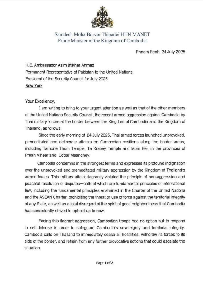 Letter to H.E. Asim Iftikhar Ahmad, permanent representative of Pakistan to the United Nations, President of the Security Council for July 2025; requesting an urgent meeting of the Security Council to stop Thailand’s aggression against Cambodia’s sovereignty.