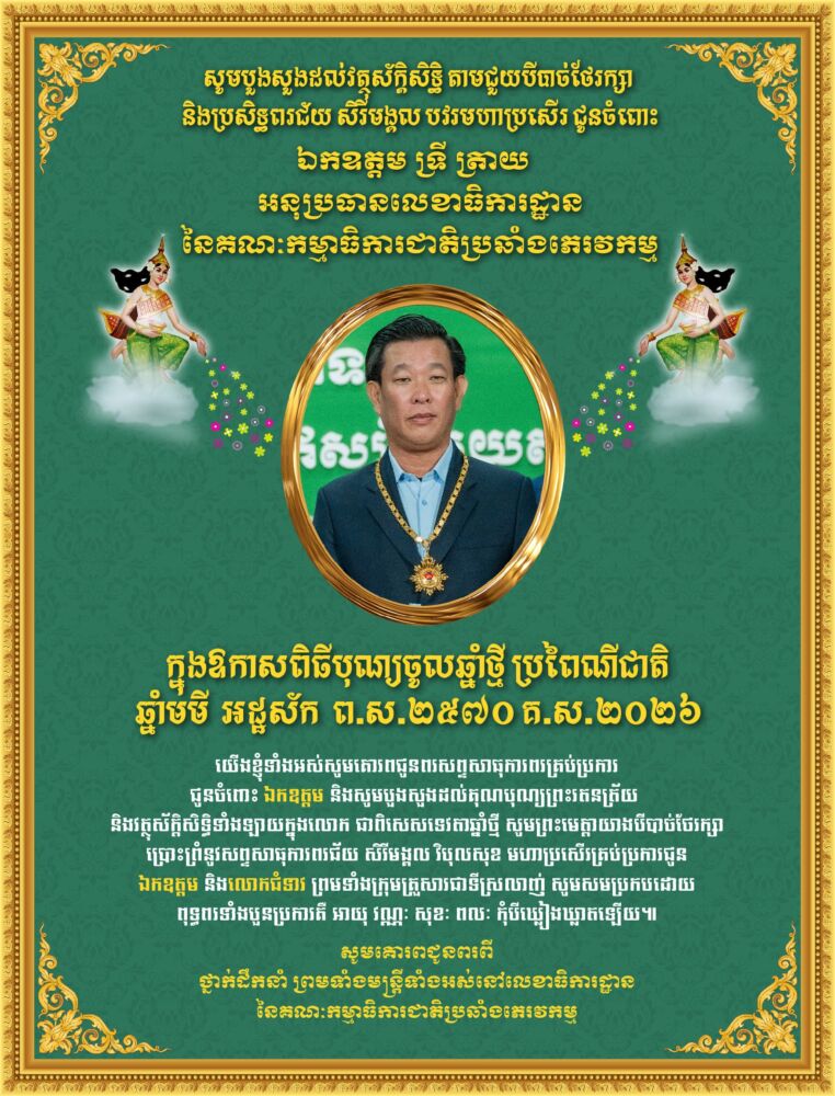 សូមបួងសួងដល់វត្ថុស័ក្តិសិទ្ធិ តាមជួយបីបាច់ថែរក្សា និងប្រសិទ្ធពរជ័យ សិរីមង្គល បវរមហាប្រសើរ ជូនចំពោះ ឯកឧត្តម ទ្រី ត្រាយ អនុប្រធានលេខាធិការដ្ឋាននៃគណៈកម្មាធិការជាតិប្រឆាំងភេរវកម្ម ក្នុងឱកាសចូលឆ្នាំថ្មី ប្រពៃណីជាតិ April 14, 2026 0