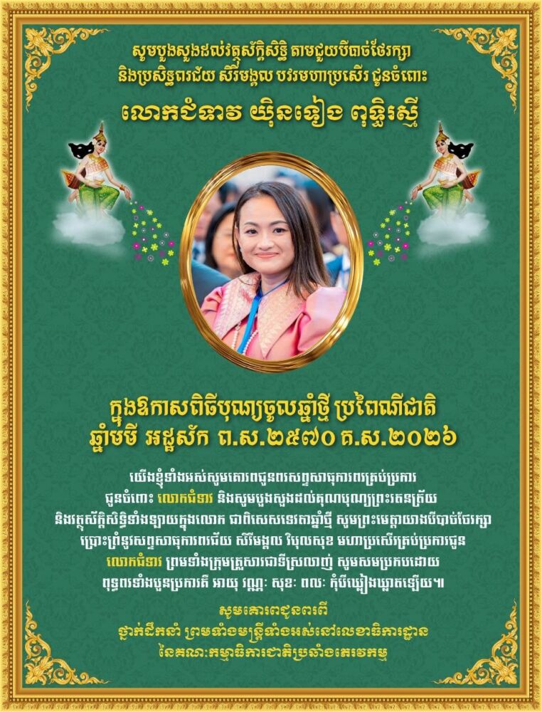សូមបួងសួងដល់វត្ថុស័ក្តិសិទ្ធិ តាមជួយបីបាច់ថែរក្សា និងប្រសិទ្ធពរជ័យ សិរីមង្គល បវរមហាប្រសើរ ជូនចំពោះ លោកជំទាវ យ៉ិនទៀង ពុទ្ធិរស្មី ក្នុងឱកាសចូលឆ្នាំថ្មី ប្រពៃណីជាតិ April 14, 2026 0