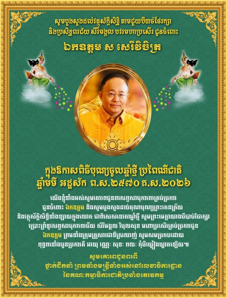 សូមបួងសួងដល់វត្ថុស័ក្តិសិទ្ធិ តាមជួយបីបាច់ថែរក្សា និងប្រសិទ្ធពរជ័យ សិរីមង្គល បវរមហាប្រសើរ ជូនចំពោះ ឯកឧត្តម ស សេរីវិចិត្រ ក្នុងឱកាសចូលឆ្នាំថ្មី ប្រពៃណីជាតិ April 14, 2026 0