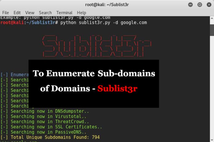 Sublist3r ជាឧបករណ៍ដែលមានមូលដ្ឋានលើ python ដែលរាយបញ្ជី domains តូចៗ ដោយប្រើប្រាស់ Google, Yahoo, Bing, Baidu និង Ask ។ វាក៏បានចុះបញ្ជីផ្នែករងដោយប្រើ Netcraft, Virustotal, ThreatCrowd, DNSdumpster, និង ReverseDNS ។