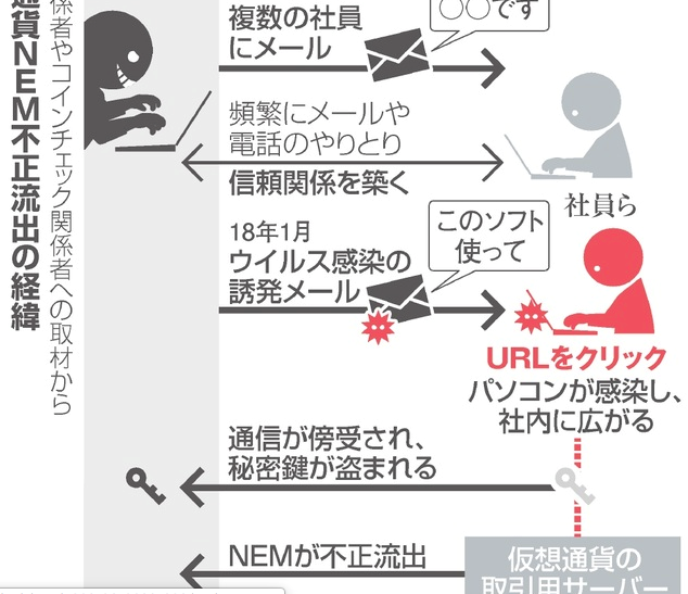 រូបិយប័ណ្ណនិម្មិតដែលមានតម្លៃប្រហែល 58 កោដិយ៉េន (អត្រានៅពេលនោះ) រូបិយប័ណ្ណនិម្មិត នៅក្នុងឧបទ្ទវហេតុដែល NEM (Nemu) ខ្ជរខ្ជាយពត៌មានជាហូរហែរកាលពី 6 ខែមុន ជនល្មើស ផ្ញើរអ៊ីម៉ែល និងទូរសព្ទ័ទៅកាន់បុគ្គលិកក្រុមហ៊ុនម្តងហើយម្តងទៀត។ ពត៌មានបែកធ្លាយនោះហាក់ដូចជាត្រូវដកប្រាក់នៅឯផ្សារហ៊ុន។ នាយកដ្ឋានប៉ូលីសក្រុងតូក្យូ កំពុងស៊ើបអង្កេតរកក្រុមជនល្មើស ហើយសន្មតថានេះជាហេតុការណ៍ដែលរៀបចំដោយចេតនា។