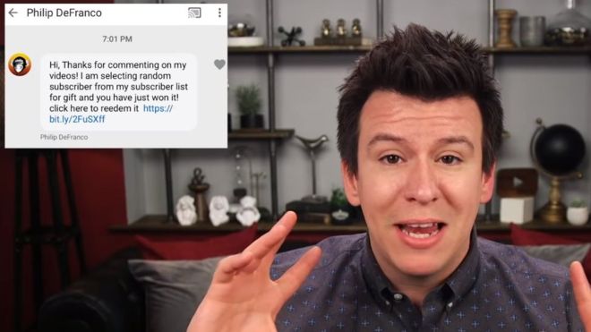 រវាងពួកគេទាំងនេះធ្វើឱ្យ YouTubers មានអ្នកចូលទស្សនាជាង ៥0 លាននាក់។អត្ថបទនៅក្នុងសារទាំងអស់គឺដូចគ្នាហើយបង្ហាញថាអ្នកចូលទស្សនាម្នាក់ត្រូវជ្រើសរើសដោយចៃដន្យដើម្បីទទួលកាដូ។Philip DeFranco រៀបរាប់អំពីការបោកប្រាស់ថាវាចាប់ផ្តើមដោយវីដេអូមួយដែលព្រមានមិនឱ្យអ្នកទស្សនាមិនត្រូវចុចលើតំណនោះ។
