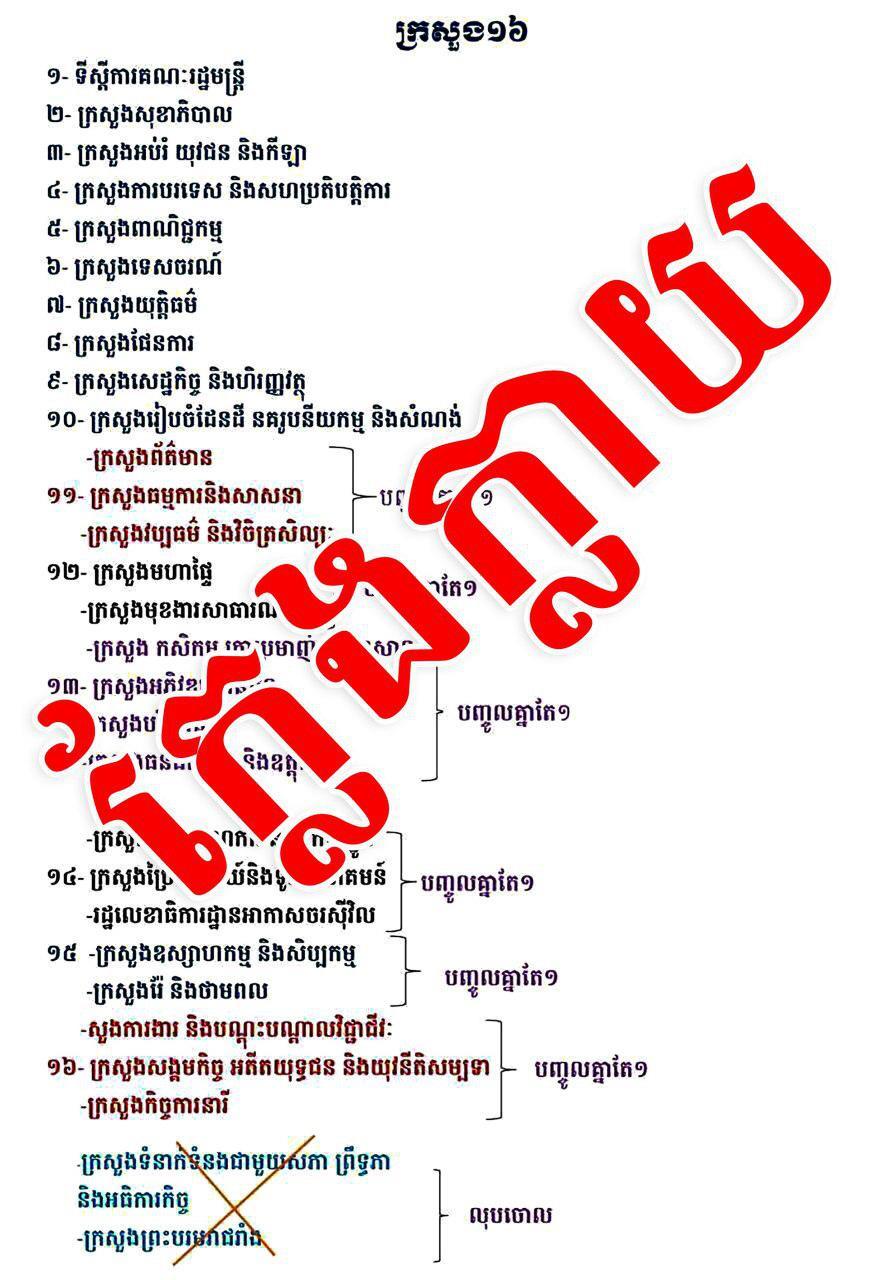 នៅល្ងាចថ្ងៃទី២៨ ខែមករា ឆ្នាំ២០១៩នេះ សម្តេចសូមប្រកាសទាត់ចោលឯកសារក្លែងក្លាយមួយ ដែលបានចែកចាយលើបណ្តាញទំនាក់ទំនងសង្គមថា រាជរដ្ឋាភិបាល មានផែនការកាត់បន្ថយក្រសួងទាំងអស់ មកត្រឹមចំនួន១៦ក្រសួង ហើយសម្តេចតេជោបានចាត់ទុកថា ការបង្កើតឯកសារក្លែងក្លាយនេះជាផែនការដ៏អាក្រក់របស់ជនទុច្ចរិត ដែលមានបំណងចង់បំផ្លាញទំនុកចិត្តលើប្រព័ន្ធការងាររបស់រាជរដ្ឋាភិបាល។