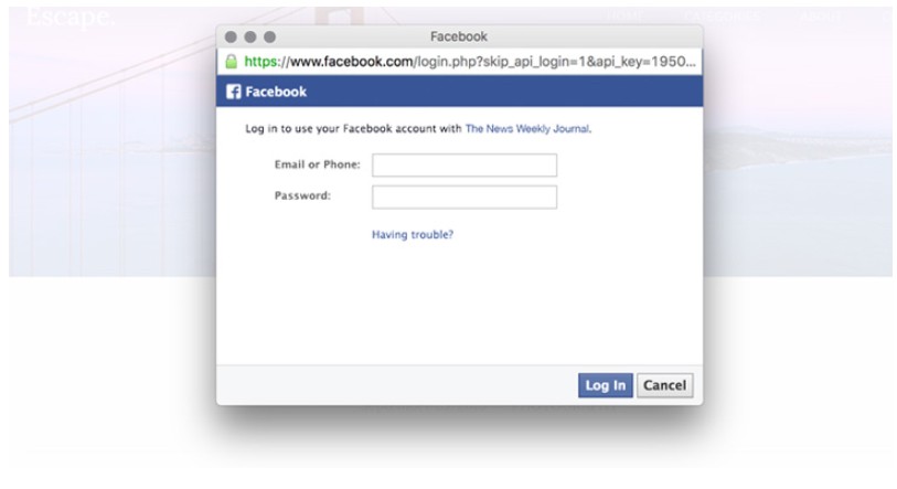 ជាទូទៅនៅពេលអ្នកចុចប៊ូតុង “ចូលប្រើ Facebook” នៅលើគេហទំព័រណាមួយអ្នកអាចប្តូរទិសដៅទៅកាន់ facebook.com ឬប្រើជាមួយ Facebook.com នៅក្នុង new pop-up browser window ដែលសួរអ្នកដើម្បីបញ្ចូលអត្តសញ្ញាណ ហ្វេសប៊ុករបស់អ្នកដើម្បីផ្ទៀងផ្ទាត់ភាពត្រឹមត្រូវដោយប្រើ OAuth និងអនុញ្ញាតឱ្យសេវាកម្មនេះចូលប្រើប្រាស់ព័ត៌មានចាំបាច់របស់ប្រវត្តិរូបរបស់អ្នក។