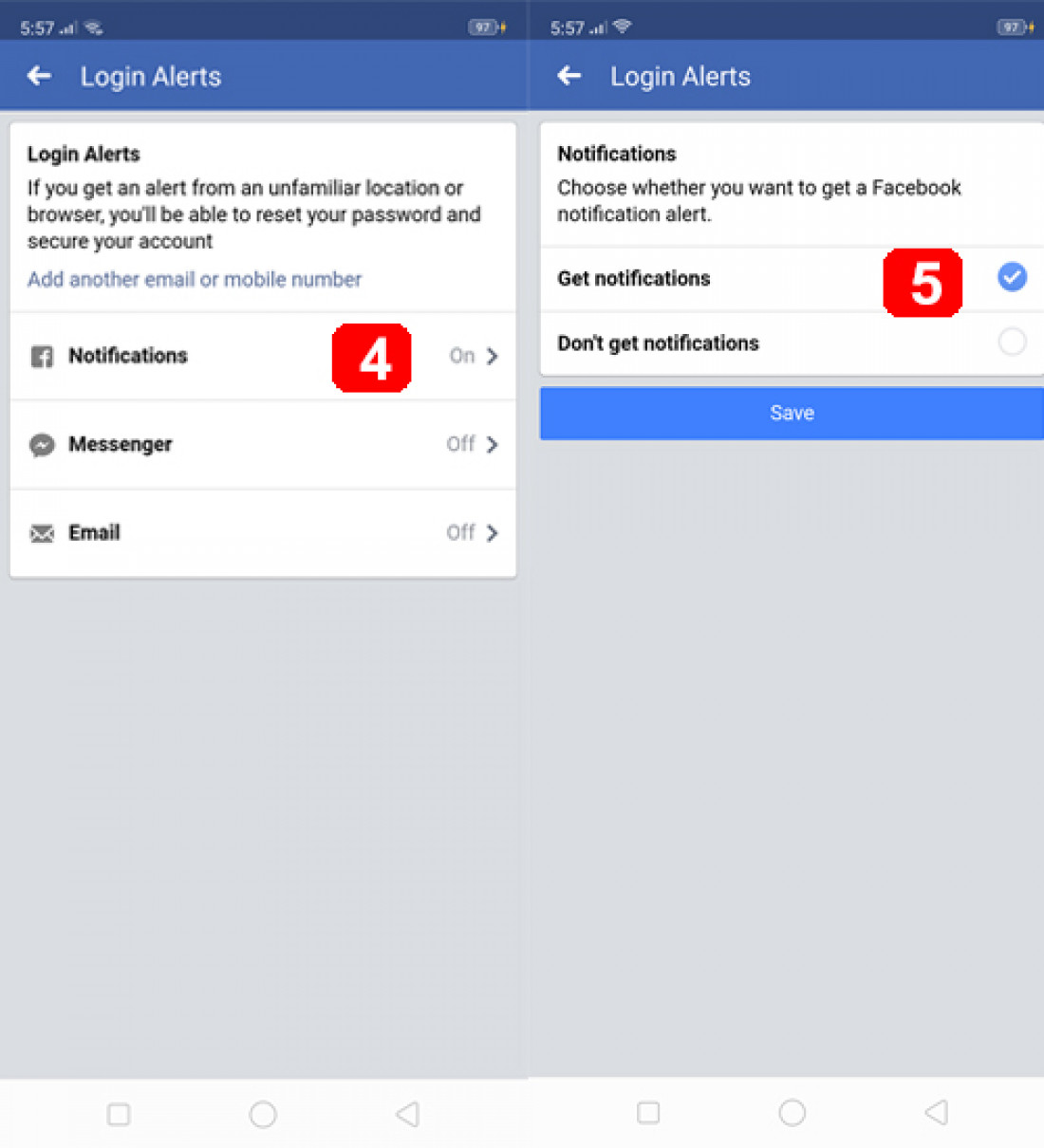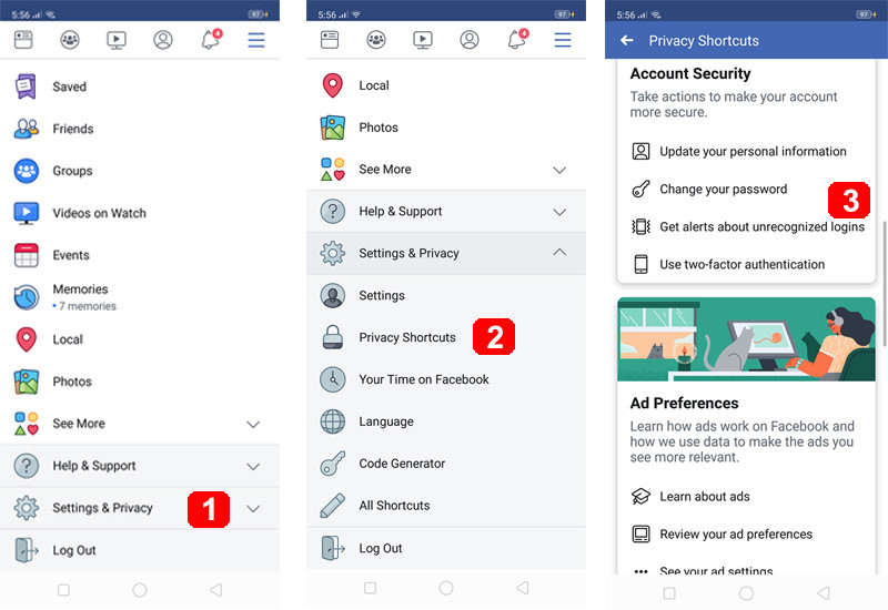 ក្នុងកម្មវិធី Facebook សូមចុចទីតាំងត្រេ ៣ > ចុចត្រង់ផ្នែកSettings & Privacy > រើសយក Privacy Shortcuts > ត្រង់ទីតាំង Account Security សូមចុចលើពាក្យ Get alerts about unrecognized logins