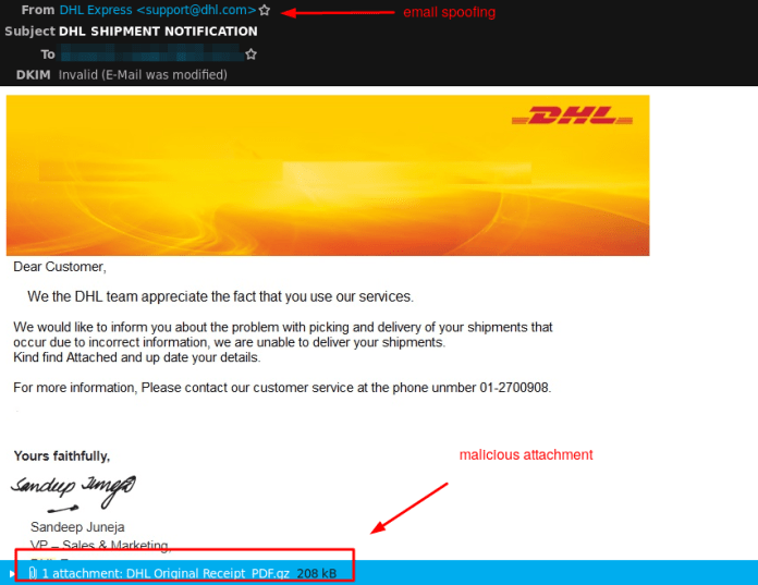 ភ្នាក់ងារគំរាមកំហែងកំពុងប្រើប្រាស់ម៉ាស៊ីនមេ SMTP និងបច្ចេកទេសក្លែងបន្លំតាមអ៊ីម៉េលដើម្បីចែកចាយយុទ្ធនាការក្លែងបន្លំ តាមក្រុមហ៊ុន DHL ដែលមើលទៅវាមានលក្ខណៈដូចជាស្របច្បាប់មួយ។ DHL គឺជាក្រុមហ៊ុនដែលល្បីល្បាញ និងជឿទុកចិត្តលើពិភពលោក ដែលផ្តល់ជូនកញ្ចប់សេវាផ្ញើសារអន្ដរជាតិ និងសេវាផ្ញើសាររហ័សមានកេរ្តិ៍ឈ្មោះត្រូវអ្នកប្រពឹត្តបទឧក្រិដបំពានយកប្រើដើម្បីចែកចាយមេរោគដ៏មានសក្តានុពល។