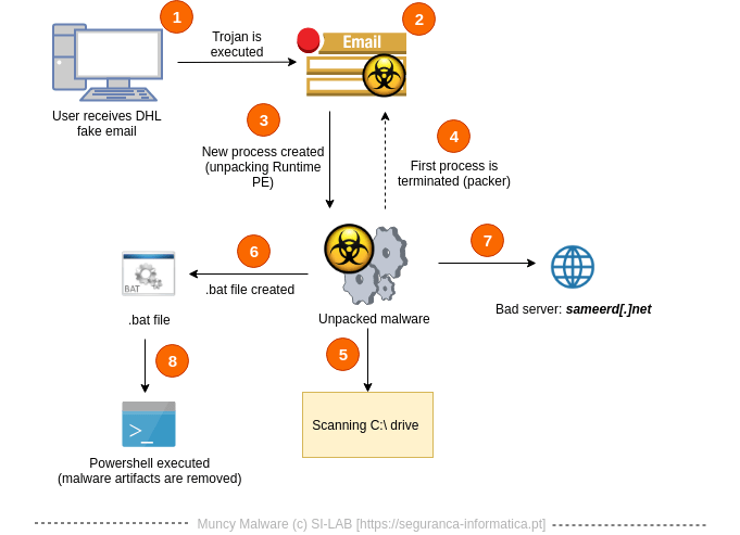 នៅពេលដែលជនរងគ្រោះបើកឯកសារភ្ជាប់វានឹងទម្លាក់ឯកសារមេរោគ Muncy នៅលើ ប្រព័ន្ធហើយមេរោគនឹងបង្កប់លើប្រព័ន្ធទាំងស្រុង។ ក្រោយមក វាចាប់ផ្តើមដំណើរការប្រតិបត្តិដំបូងដោយពន្លាឯកសារ PE ទៅផ្នែកទិន្នន័យ និងស្កេនទាំងស្រុងលើដ្រាយ C: \ drive ដើម្បីស្វែងរកឯកសារសំខាន់។ដំណើរការរបស់មេរោគ MUNCY”យុទ្ធនាការឆបោកកំពុងព្យាយាមក្លែងបន្លំលើ DHL ហើយមេរោគត្រូវគេភ្ជាប់ក្នុងអ៊ីម៉េល” យោងតាមប្រសាសន៍របស់ស្ថាបនិក និង Pentester នៅ CSIRT.UBI, Pedro Tavares ដែលរកឃើញមេរោគនេះប្រាប់ទៅ GBHackers តាមរយៈអ៊ីម៉េល។”