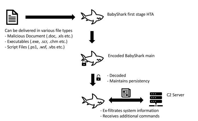 ការឆ្លងមេរោគនេះចាប់ផ្តើមដោយអ៊ីម៉ែលផ្ទុកឯកសារមេរោគ Excel មានគ្រោះថ្នាក់ដែលភ្ជាប់នៅពេលដែលបានប្រតិបត្តិម៉ាក្រូផ្ទុកមេរោគថ្មីដែលមានមូលដ្ឋានលើស្គ្រីប Microsoft Visual Basic (VB) ដែលមានឈ្មោះថា BabyShark ។ ដំណាក់កាលដំបូងរបស់ HTA ត្រូវគេទាញយកពីទីតាំងពីចម្ងាយ និងផ្ញើសំណើរ HTTP GET ទៅកាន់ទីតាំងមួយផ្សេងទៀតនៅលើម៉ាស៊ីនបម្រើ C2 ដូចគ្នាដែលកាត់ស្គ្រីប BabyShark VB ។
