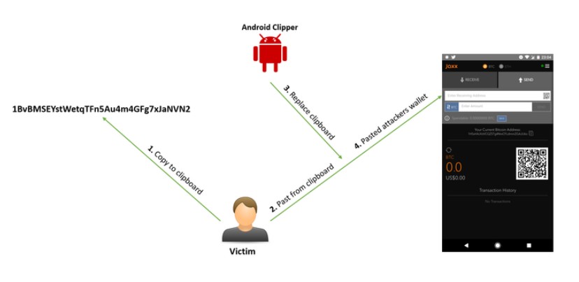 មេរោគ malware clipper គេស្គាល់ថាជា Android / Clipper.C ដោយ ESET ឆ្លៀតយកប្រយោជន៍ ពីឥរិយាបថនេះដើម្បីលួចយកទិន្នន័យសម្ងាត់របស់អ្នកប្រើប្រាស់។ ដើម្បីធ្វើដូចនេះអ្នកវាយប្រហារ បោកបញ្ឆោតអ្នកប្រើដំបូងក្នុងការដំឡើងកម្មវិធីព្យាបាទដែលក្លែងខ្លួនជាសេវាអ៊ីនធ័រណែតដែលហៅថា MetaMask ដោយអះអាងថាអនុញ្ញាតឱ្យអ្នកប្រើរត់កម្មវិធី Ethereum ក្នុងកម្មវិធីរុករកបណ្ដាញ របស់ពួកគេដោយមិនចាំបាច់រត់ Ethereum ពេញលេញ។ ជាផ្លូវការកំណែ MetaMask ស្របច្បាប់អាច ប្រើតែផ្នែកបន្ថែមនៃកម្មវិធីរុករកបណ្ដាញសម្រាប់ Chrome, Firefox, Opera ឬ Brave ប៉ុណ្ណោះទេ ហើយវាមិនទាន់បើកដំណើរការនៅលើហាងលក់ទំនិញតាមទូរស័ព្ទណាមួយឡើយ។ ទោះជាយ៉ាងណាក៏ដោយ Stefanko ប្រទះឃើញកម្មវិធី MetaMask ដែលមានគ្រោះថ្នាក់នៅលើ Play Store ដែលសំដៅទៅលើអ្នកប្រើដែលចង់ប្រើកំណែចល័តរបស់សេវាកម្មដោយផ្លាស់ប្តូរអាស័យដ្ឋាន cryptocurrency wallet ស្របច្បាប់របស់ខ្លួនទៅកាន់អាស័យដ្ឋានរបស់ hacker តាមរយៈ clipboard។