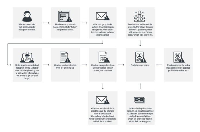 ក្រុមហេគឃ័រទទួលបានគោលដៅមានឥទ្ធិពលលើប្រព័ន្ធអ៊ីនធឺណិត ឬប្រព័ន្ធផ្សព្វផ្សាយ សង្គម ដែលមានឥទ្ធិពលលើគណនីរបស់ Instagram ជាមួយតំណភ្ជាប់ការលួចបន្លំ និងទទួលបានគណនីមុននឹងអ្នកដឹងថាមានអ្វីដែលកំពុងកើតឡើង។ ផ្អែកលើរបាយការណ៍របស់ Trend Micro អ្នកវាយប្រហារកំណត់គោលដៅលើ Instagram មានអ្នកគាំទ្រពី ១៥០០០ ទៅ ៧០ ០០០ នាក់ ពីគោលដៅល្បី ៗ និងពីអ្នកចម្រៀងទៅម្ចាស់អាជីវកម្មដូចជាការជួលសម្ភារៈថត រូបជាដើម។