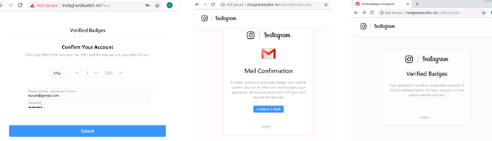 ការវាយប្រហារនេះចាប់ផ្តើមជាមួយនឹងអ៊ីម៉ែលក្លែងបន្លំដែលហាក់ដូចជាផ្ញើរមកពី Instagram ស្នើឱ្យជនរងគ្រោះផ្ទៀងផ្ទាត់គណនីដើម្បីទទួលបានផ្លាកសញ្ញាដែលផ្ទៀងផ្ទាត់នៅលើប្រូហ្វាល Instagram។ ប្រសិនបើជនរងគ្រោះចុចលើប៊ូតុងផ្ទៀងផ្ទាត់គណនី។ ក្រោយមកប្រសិនបើ ជនរងគ្រោះចុចលើទំព័របន្លំ ដែលទាមទារពត៌មានលំអិតរបស់អ្នកប្រើមានដូចជា៖ ថ្ងៃ ខែ ឆ្នាំ កំណើត អ៊ីមែល និងព័ត៌មានបញ្ជាក់អត្តសញ្ញាណ។ “នៅពេលដែលផ្ញើរព័ត៌មានទៅ កញ្ចប់ជូនដំណឹងមួយនឹងបង្ហាញ ប៉ុន្តែមានរយៈពេលតែបួនវិនាទីប៉ុណ្ណោះ។ នេះគឺជាល្បិចកលមួយដែលបញ្ជាក់ថា ប្រូហ្វាលរបស់ពួកគេត្រូវបានផ្ទៀងផ្ទាត់ ”