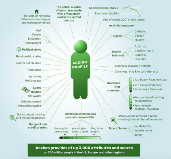 តាមរយៈការទិញ ឬផ្តល់អាជ្ញាប័ណ្ណទិន្នន័យ ឬការកត់ត្រាកំណត់ត្រាសាធារណៈ ក្រុមហ៊ុនទិន្នន័យរបស់ភាគីទីបីអាចប្រមូលផ្តុំរាប់ពាន់គុណលក្ខណៈនីមួយៗសម្រាប់មនុស្សរាប់ពាន់លាននាក់។ អស់រយៈពេលជាច្រើនទសវត្សមកហើយ ក្រុមហ៊ុនជាច្រើនអាចទិញបញ្ជីអ្នកចុះឈ្មោះទស្សនាវដ្តីដើម្បីបង្កើតកម្មវិធីផ្សាយពាណិជ្ជកម្មគោលដៅ។ សព្វថ្ងៃនេះ ប្រសិនបើអ្នកប្រើស្មាតហ្វូនឬប័ណ្ណឥណទាន វាមិនពិបាកទេសម្រាប់ក្រុមហ៊ុនមួយដើម្បីកំណត់ថាតើអ្នកទើបតែឆ្លងកាត់ការបែកបាក់ តើអ្នកមានផ្ទៃពោះ ឬព្យាយាមបញ្ចុះទម្ងន់មិនថាអ្នកជាមនុស្សរួសរាយ ឱសថអ្វីដែលអ្នកត្រូវប្រើ និងកន្លែងដែលអ្នកទៅ និងសូម្បីតែពេលអ្នកប្រើស្មាតហ្វូនរបស់អ្នក។ (កម្មវិធីរុករក cookies និងកម្មវិធីតាមដានគឺជាផ្នែកមួយដ៏សំខាន់នៃហេដ្ឋារចនាសម្ព័ន្ធនេះ ហើយគេហទំព័រក្រុមហ៊ុនជាច្រើនពឹងផ្អែកលើពួកគេដើម្បីបម្រើមាតិកានិងពាណិជ្ជកម្ម) ។