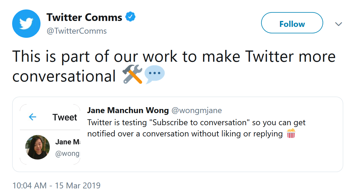 អ្នកស្រី Jane និយាយថាលក្ខណៈពិសេសនេះគេហៅថា “Subscribe to conversation” ហើយបើសិនជា សមាជិក Twitter ចុះឈ្មោះ នោះគាត់នឹងទទួលការជូនដំណឹងនៅពេលដែលមានការឆ្លើយតបថ្មី ចំពោះការសន្ទនា។ បន្ទាប់ពី Jane ផ្សព្វផ្សាយពី Twitter ថា Twitter កំពុងសាកល្បង “Subscribe to conversation” គណនី Twitter ផ្លូវការរបស់ Twitter សរសេរថា “នេះគឺជាផ្នែកមួយនៃការងាររបស់ យើងដើម្បីធ្វើឱ្យ Twitter អាចធ្វើការសន្ទនា”។