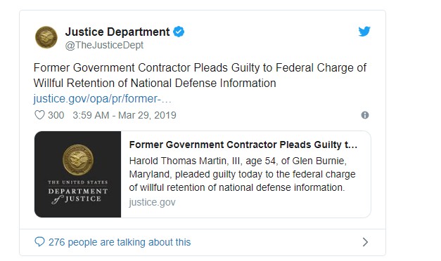 អតីតអ្នកម៉ៅការរបស់ NSA លោក Harold Martin មានអាយុ ៥៤ ឆ្នាំត្រូវគេរកឃើញថា មាន ទោសពីបទលួចព័ត៌មានសម្ងាត់បំផុតនៅអាមេរិកហើយគាត់ត្រូវជាប់គុក២០ ឆ្នាំ។ លោក Harold ត្រូវគេទទួលស្គាល់ថា ជាអ្នកទទួលបានព័ត៌មានអាថ៌កំបាំងបំផុត របស់ក្រសួងការពារ ជាតិប៉ុន្តែគាត់បំពានលើការទុកចិត្ត និងដាក់ឱ្យសន្តិសុខជាតិស្ថិតក្នុងស្ថានភាពគ្រោះថ្នាក់ ដោយការទុកឯកសារសំខាន់បំផុតនៅផ្ទះ និងឡានរបស់គាត់ក្នុងរយៈពេល២០ ឆ្នាំមុន។