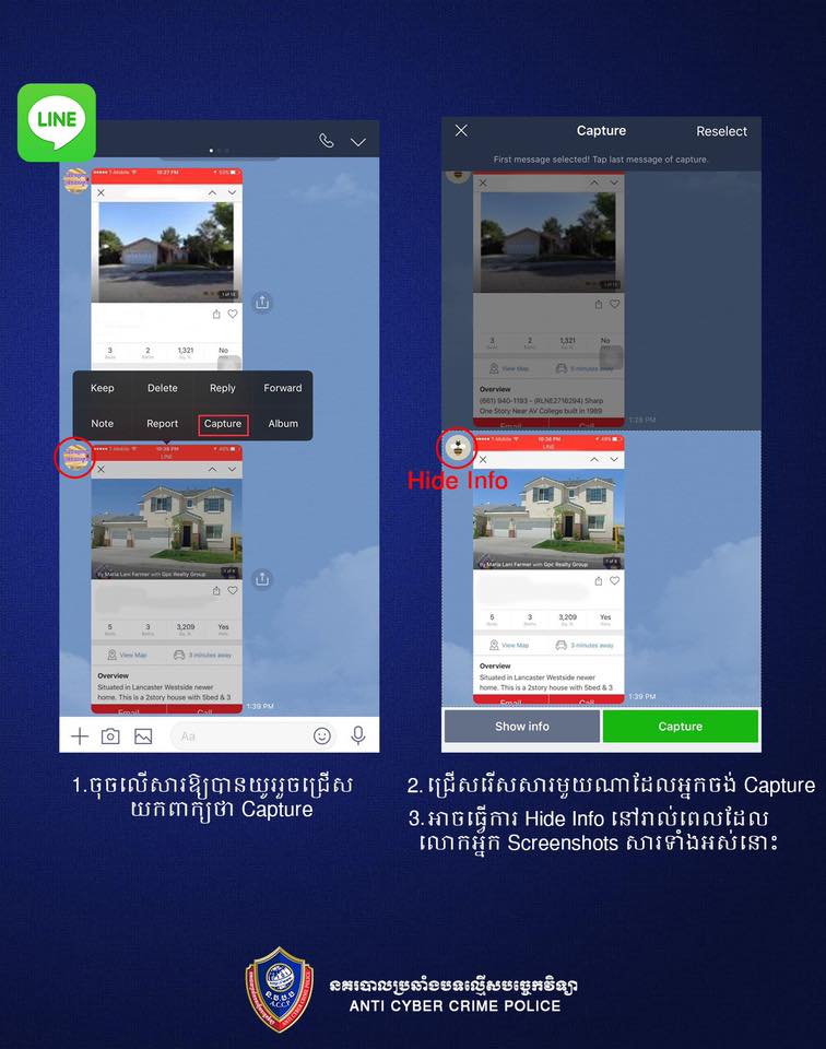 – ធ្វើការថតអេក្រង់ (Screenshots)នៃការសន្ទនា ដែលលោកអ្នកអាចកំណត់ចំនួនសារ ដែលលោកអ្នកចង់ថត ដោយគ្រាន់តែចុចលើសារនោះឱ្យយូរបន្តិច រួចជ្រើសយកពាក្យ “Capture” ហើយជ្រើសយកចំនួនសារដែលអ្នកចង់ថត។ លើសពីនេះទៀត លោកអ្នកក៏អាចបាំងរូប profile របស់អ្នកផ្ញើរទៀតផង ដូចបានបង្ហាញក្នុងរូបភាពខាងក្រោម។