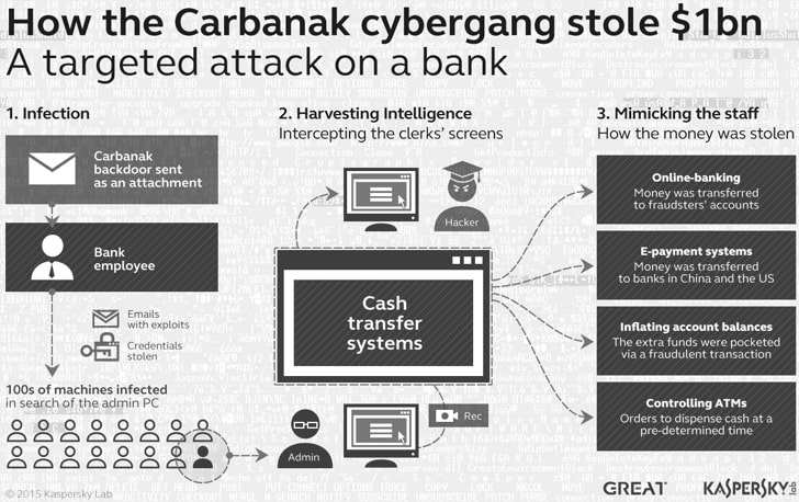 ក្រុម hacker ចាប់ផ្តើមសកម្មភាពរបស់ខ្លួនអស់រយៈពេលជិត 6 ឆ្នាំមកហើយដោយចាប់ផ្តើមការវាយប្រហារដោយមេរោគមួយដោយប្រើ Anunak និង Carbanak ដើម្បីសម្របសម្រួលបណ្តាញធនាគារនិងអេធីអឹមនៅទូទាំងពិភពលោក ដោយហេតុនេះទើបមានការលួចលុយជាងមួយពាន់លានអឺរ៉ូពីធនាគារច្រើនជាង ១០០ នៅទូទាំងពិភពលោក។អ្នកវាយប្រហារផ្ញើអ៊ីមែលបន្លំដែលមានមេរោគទៅបុគ្គលិករាប់រយនាក់នៅធនាគារខុសៗគ្នាដែលពួកឆ្លងមេរោគ Carbanak ចូលក្នុងកុំព្យូទ័រ។