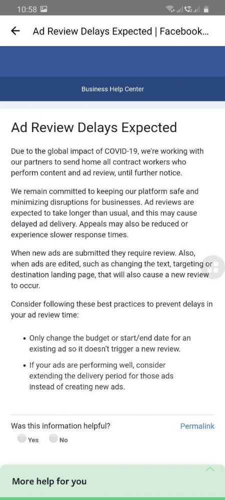 បែបនេះរាល់ការស្នើនូវ Ads ថ្មីឬ Boost លើការ Post ថ្មីណាមួយ នោះនឹងទាមទារពេលយឺតជាងមុន ហើយក្រុមហ៊ុនក៏សូមអធ្យាស្រ័យទុកជាមុនចំពោះបញ្ហាយឺតយ៉ាវនេះដូចគ្នា។ជាសារណែនាំក្នុងស្ថានភាពបច្ចុប្បន្ននេះ Facebook អំពាវនាវឲ្យអ្នកធ្វើមាតិកាដែលរមែងផ្សពផ្សាយពាណិជ្ជកម្មលើ Facebook ទាំងអស់ គួរតែធ្វើការកែប្រែព័ត៌មានឬ Boost បន្ត លើមាតិកាចាស់ ប្រសិនជាអាច ព្រោះការធ្វើបែបនោះនឹងមិនទាមទារពេល Review ថ្មីទៀតឡើយ ជាជាងចាយពេលរង់ចាំយូរលើការ Review Ads ថ្មីដែលអ្នកបានស្នើ៕